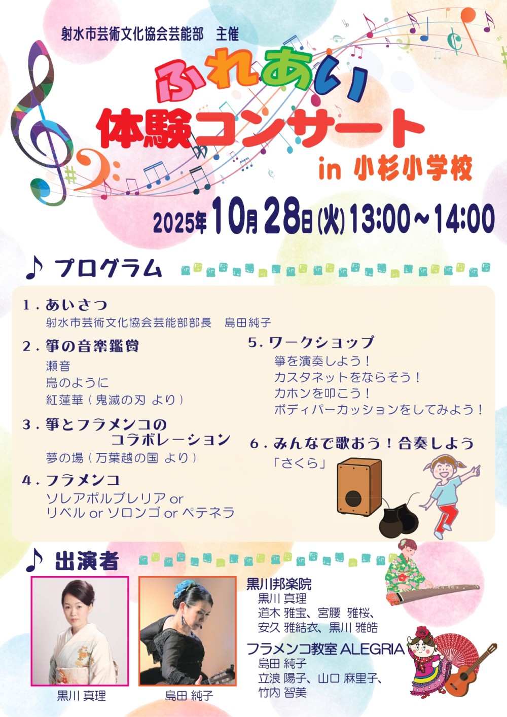 今年2回目となる学校公演は、黒川邦楽院の皆さんとの共演。体験も行いました |