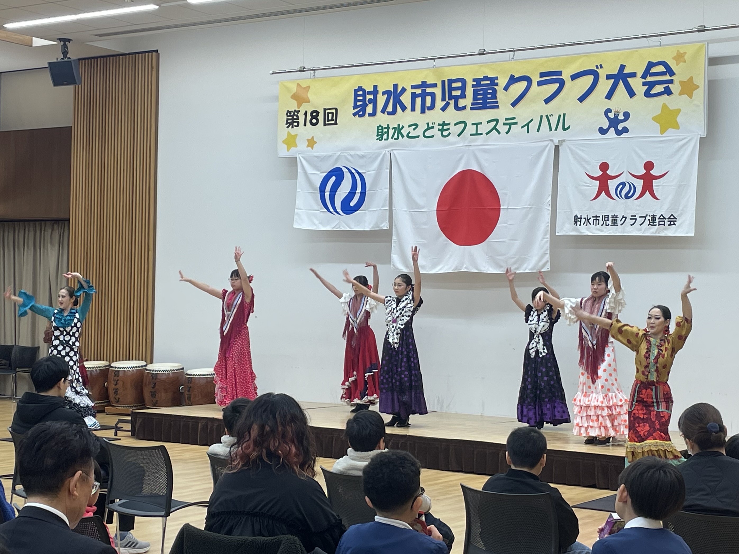 | 児童クラブのイベントということで、小学4~6年生のALEGRIAキッズメンバーが中心となり、元気に3曲を披露しました。華やかな衣装やメイクも楽しかった! |